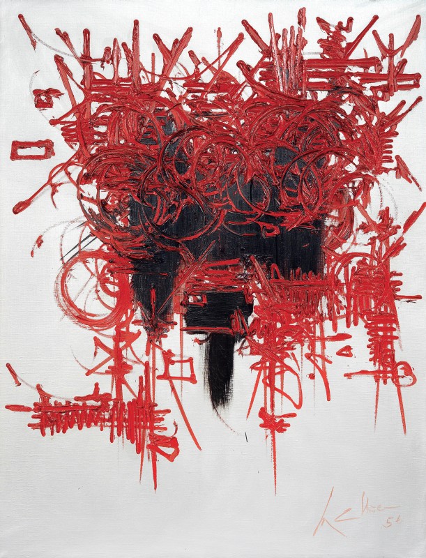 Georges Mathieu Boulogne-sur-mer 1921 - Boulogne-Billancourt 2012 Nicephore II, 1956 Olio su tela, cm. 116x89 Firma e data in basso a destra: Mathieu / 56; titolo e data al verso sul telaio: "Nicephore II" / (1956); sulla tela dedica: Pour [...] / en 25 Mai 2006 / Mathieu. Esposizioni: Les Mathieu de Mathieu, Antibes, Museo Picasso, 9 luglio - 31 ottobre 1976, cat. n. 10; Les Mathieu de Mathieu, Ostende, Casino-Kursaal, 2 luglio - 28 agosto 1977, cat. n. 9; Mathieu. Rétrospective et Oeuvres récentes, Avignone, Palazzo dei Papi, 7 agosto - 25 ottobre 1985, cat. n. 18.