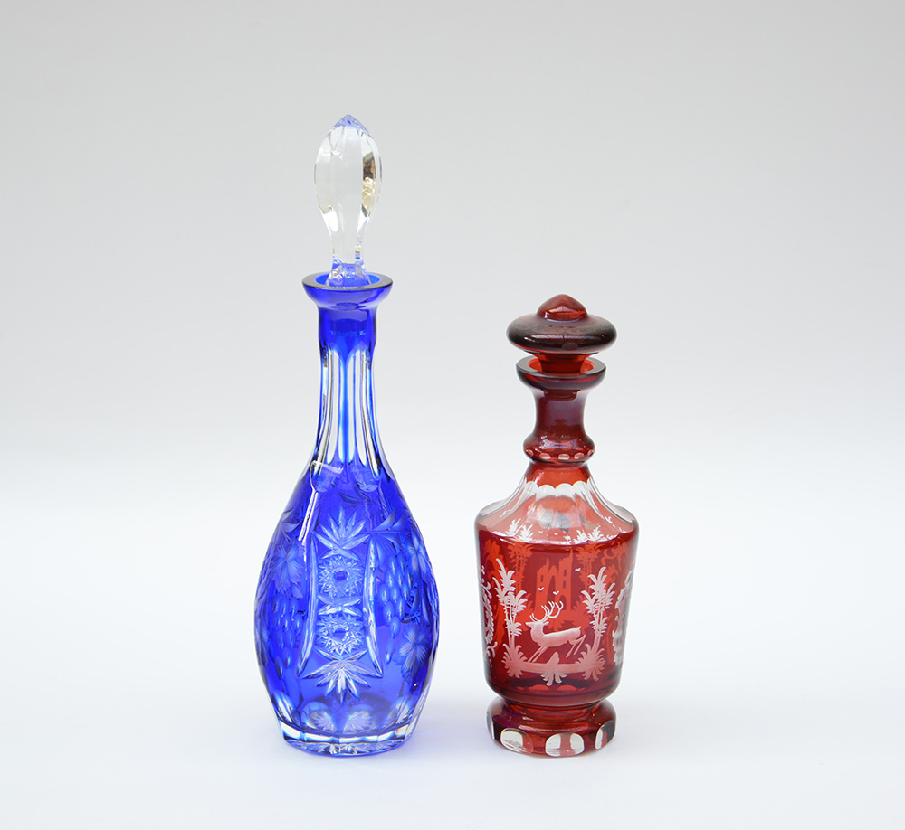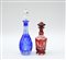 Manifattura di Boemia. Lotto di due bottiglie in cristallo molato nei toni del rosso e del blu (lievi difetti)