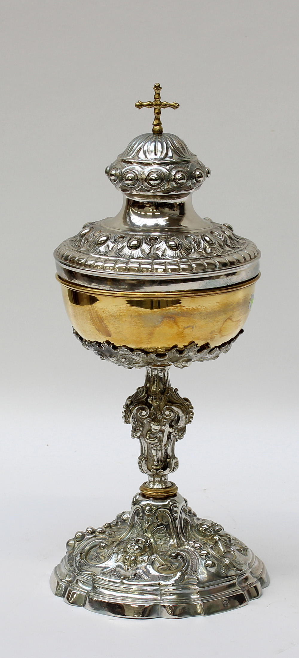 Pisside in ottone argentato decorato a teste di cherubini e motivi vegetali(h cm 33)