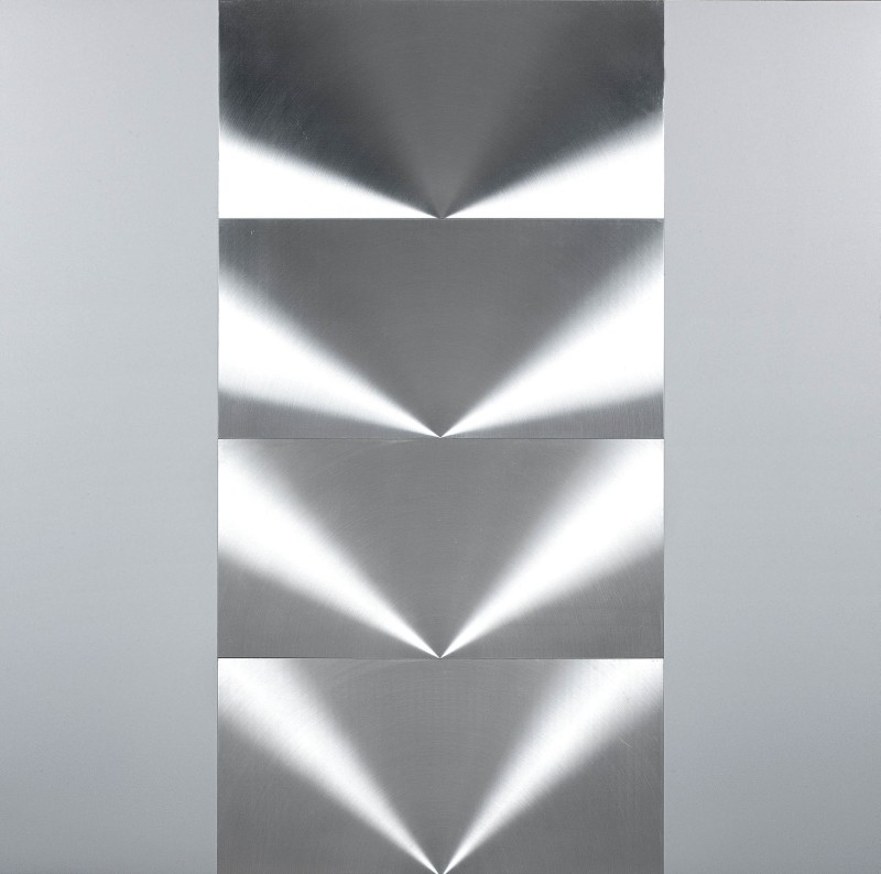 Getulio Alviani Udine 1939 Superficie a testura vibratile da modulo continuo, 1972 Alluminio, cm. 96x95,5 Firma, titolo e data al verso: Getulio Alviani / "Superficie / a / testura / vibratile" / da modulo continuo / Alluminio 1972. Foto autenticata dall'artista.