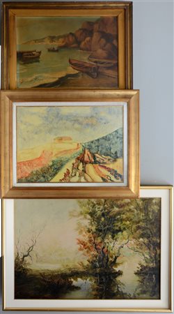 Lotto composto da tre dipinti raffiguranti paesaggi, autori e misure diverse. In cornici (difetti)