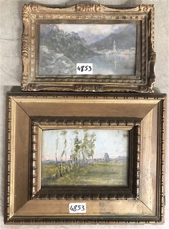 Lotto composto da un piccolo dipinto ad olio su cartone raffigurante paesaggio (cm 11x15) firmato C.Zocchi ed uno su compensato raffigurante scorcio di lago (cm 9x17) firmato Ag. Ir. Sala. In cornici (difetti)