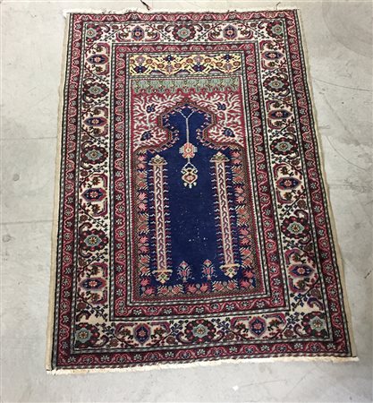 Tappeto preghiera, Anatolia, secolo XX. Mirab a fondo blu con colonne e...