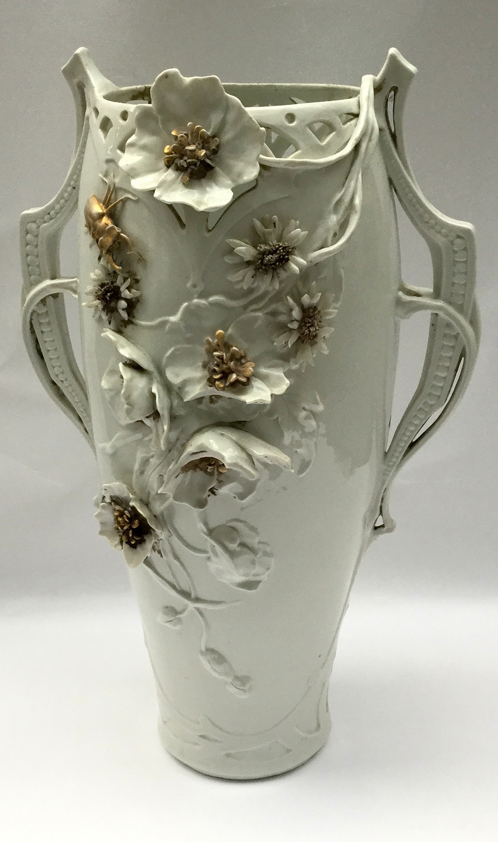 Vaso Art nouveau biansato in ceramica smatata bianca decorato con fiori in rilievo. (difetti)