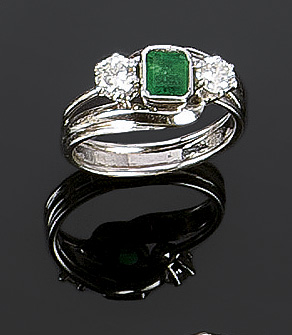 ANELLO Anello in oro bianco con al centro smeraldo di ct 0,70 di taglio rettangolare con ai lati due diamanti taglio brillante rotondo per complessivi ct 0,60 ca Peso gr. 6,087 Certificato di analisi R.A.G. n. C004mn/11N rilasciato in data 9/09/2011 Misura 15