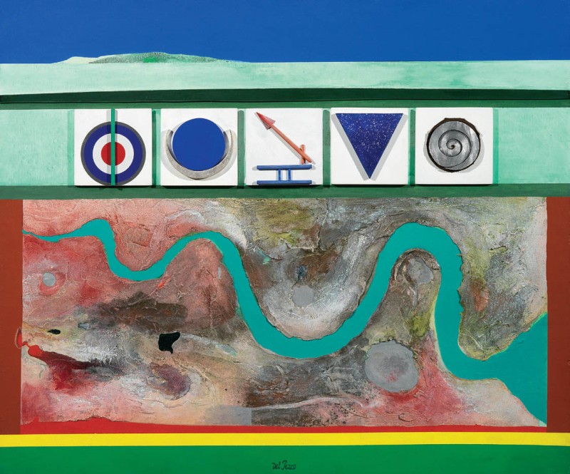 Lucio Del Pezzo Napoli 1933 Il grande fiume, 1996 Acrilico e collage su legno, cm. 100x120 Firma in basso al centro: Del Pezzo; firma, titolo e data al verso: Lucio Del Pezzo / "Il grande fiume" / collage, colore acrilico su / legno - cm 100x120 / 1996: timbro Vinciana / Galleria d'Arte in Milano: due etichette XIII Quadriennale d'Arte di Roma / "Proiezioni 2000. Lo spazio delle arti visive nella civiltà multimediale" / Roma, Palazzo delle Esposizioni 18 giugno 1999 - 10 settembre 1999. Foto autenticata dall'artista con etichetta Archivio Lucio Del Pezzo e timbro a secco Galleria Vinciana, Milano, con n. 05170.