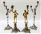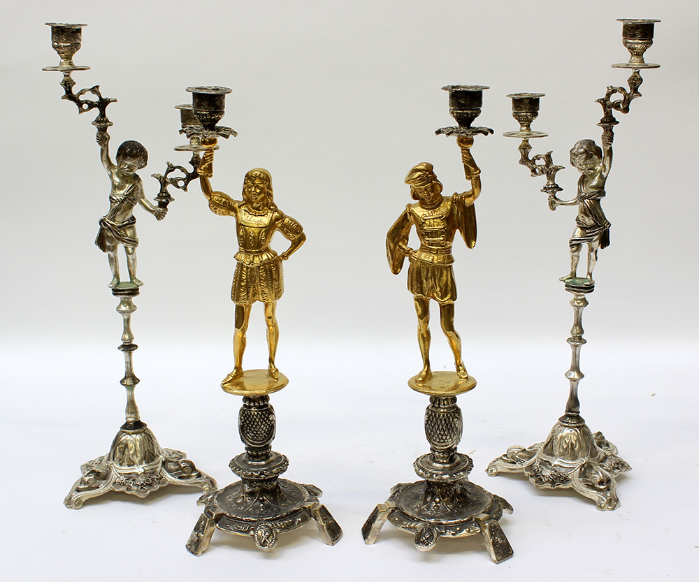 Lotto composto da due coppie di candelieri a due fiamme in bronzo e metallo argentato con corpi figurati