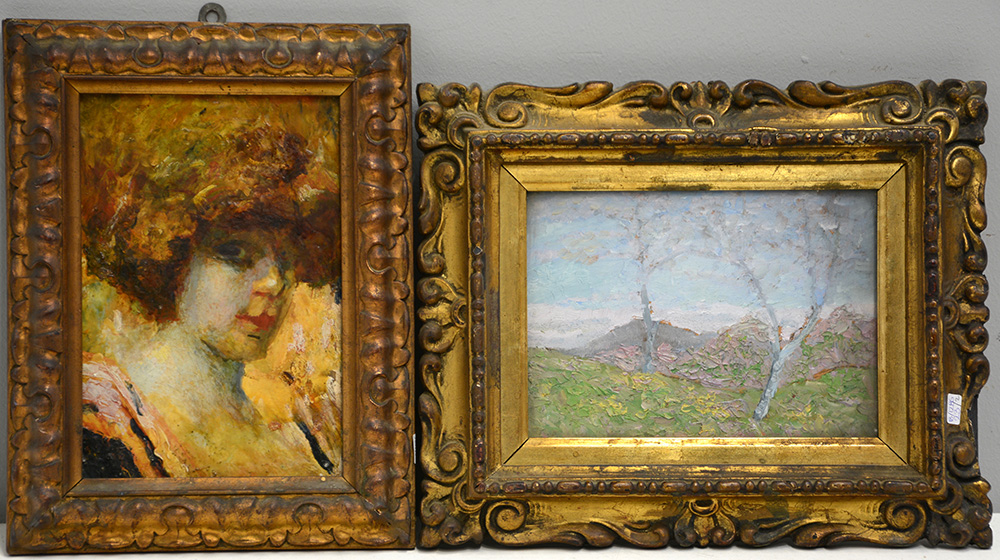 Lotto composto da due dipinti ad olio raffiguranti paesaggio e volto femminile, autori e misure diverse, in cornici (difetti)