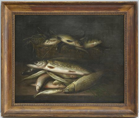 "Pesci", 1827, olio su tela (cm 53x65,5) in cornice. Firmato e datato in basso a sinistra "D. Richardson 1827" (difetti)