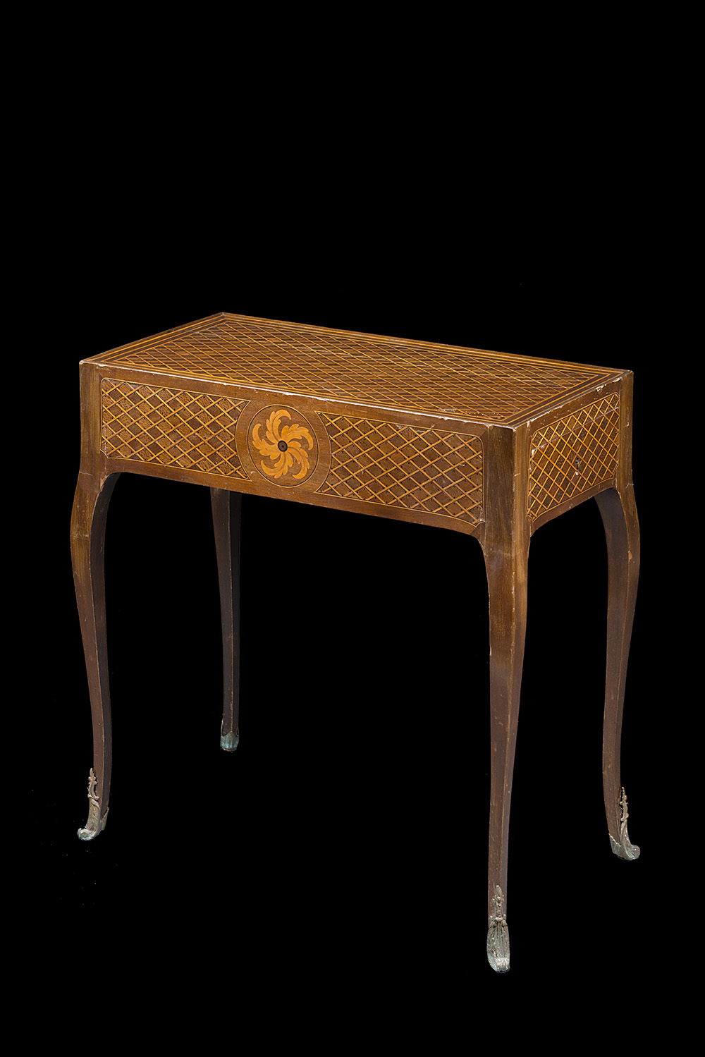 Tavolino da centro a due cassetti con corpo interamente decorato a marqueterie romboidali e rosoni centrali in legno chiaro. Gambe mosse terminanti con scarpette in bronzo (cm 70x72,5x36,5) (difetti)