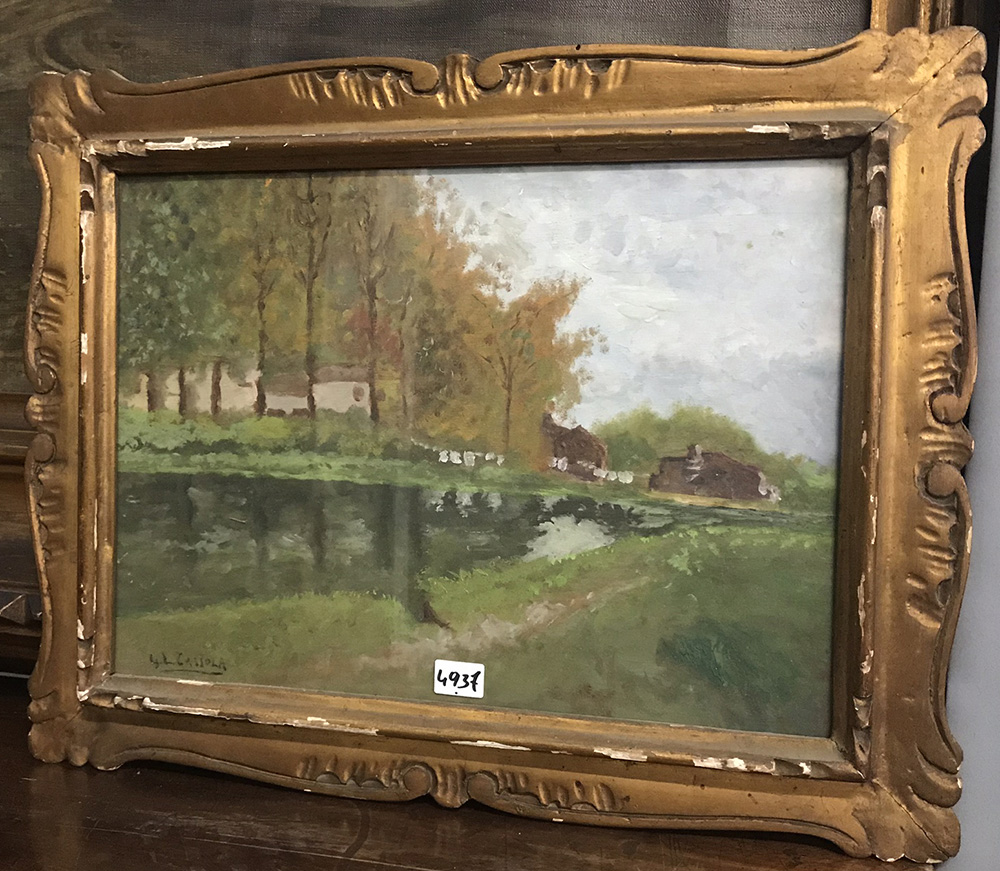 Ignoto "Paesaggio con torrente" olio su compensato (cm 30x40) reca firma indecifrata in basso a sinistra, in cornice (difetti)