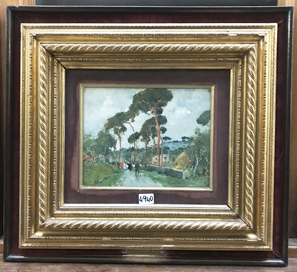 "Scorcio con alberi e figure" olio su compensato (cm 19x24)firmato e locato a Napoli in basso a destra, in cornice (difetti)