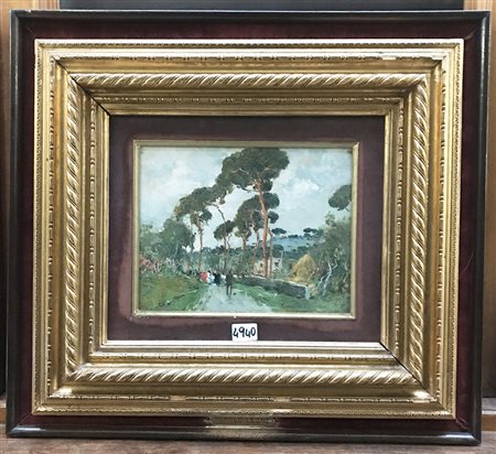Romolo Leone (Napoli 1883 - 1958)"Scorcio con alberi e figure" olio su...