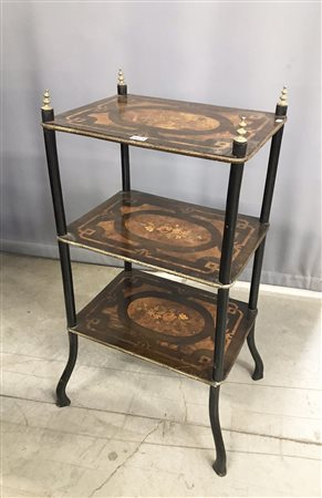 Etagere a tre ripiani lastronati, filettati e intarsiati con motivi floreali e attrezzi agricoli. Montati torniti ed ebanizzati con applicazioni in metallo dorato, fine secolo XIX (cm 40x82x30) (difetti)