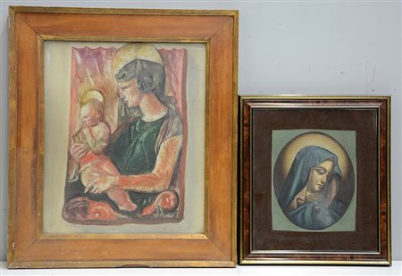 Lotto composto da un dipinto raffigurante Madonna con bambino da Donatello e un dipinto raffigurante Madonna. Autori e misure diverse, in cornici (difetti)