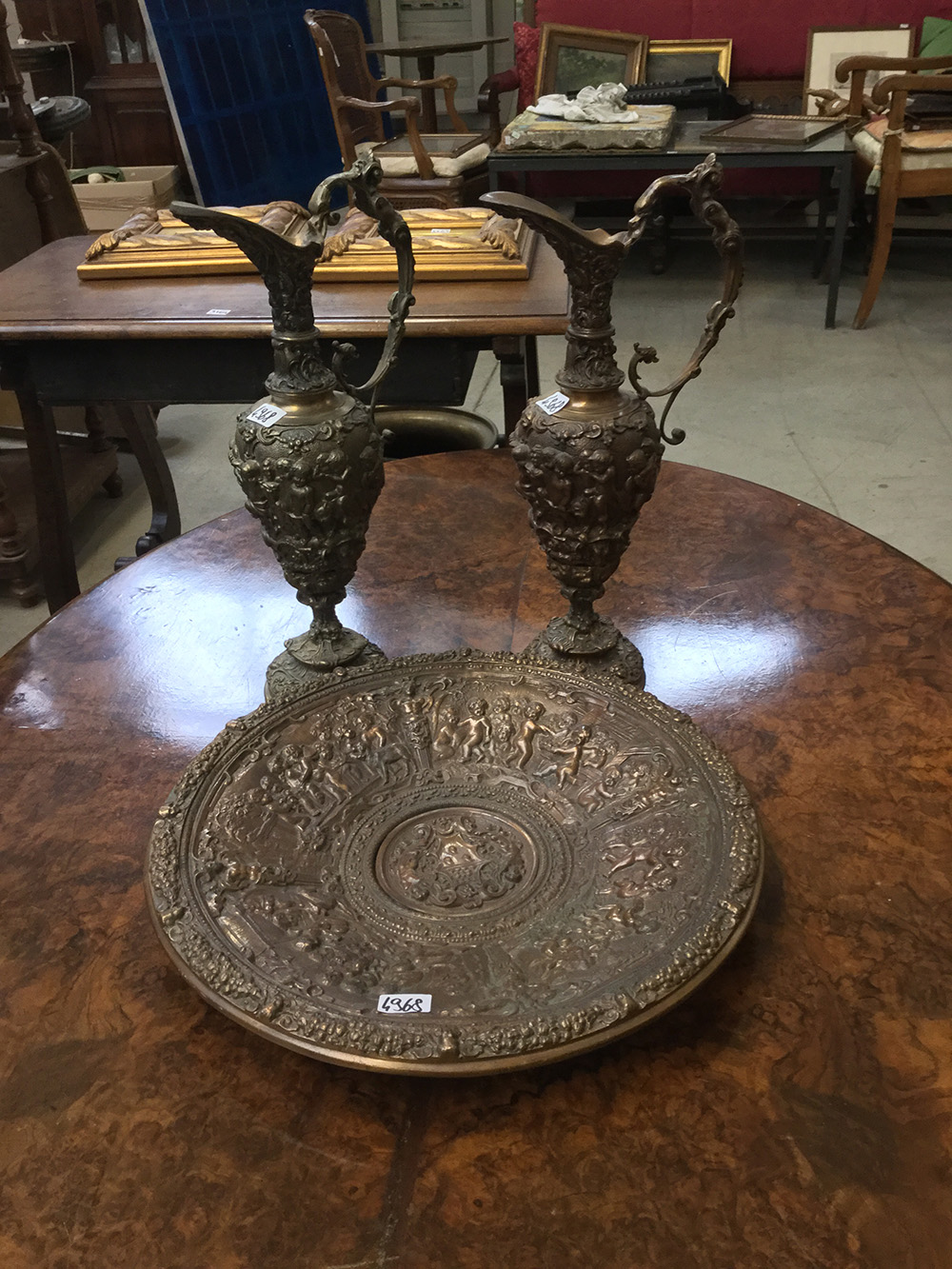 Lotto composto da un acquamanile con piatto in bronzo, unito ad uno di simile decoro