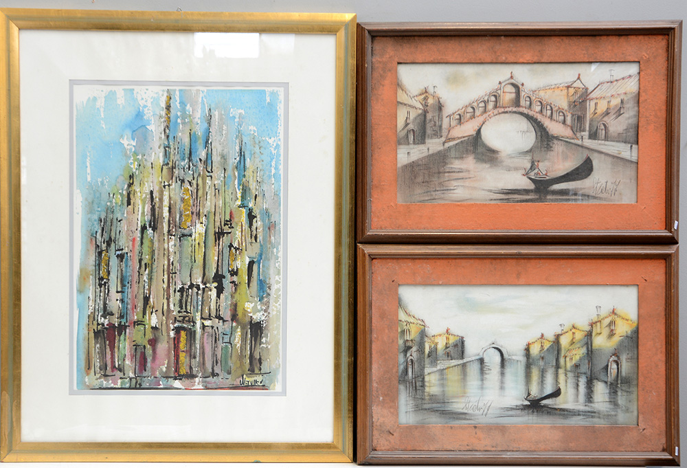 Lotto composto da tre opere moderne di soggetto, autori e misure diverse, in cornici (difetti)