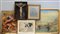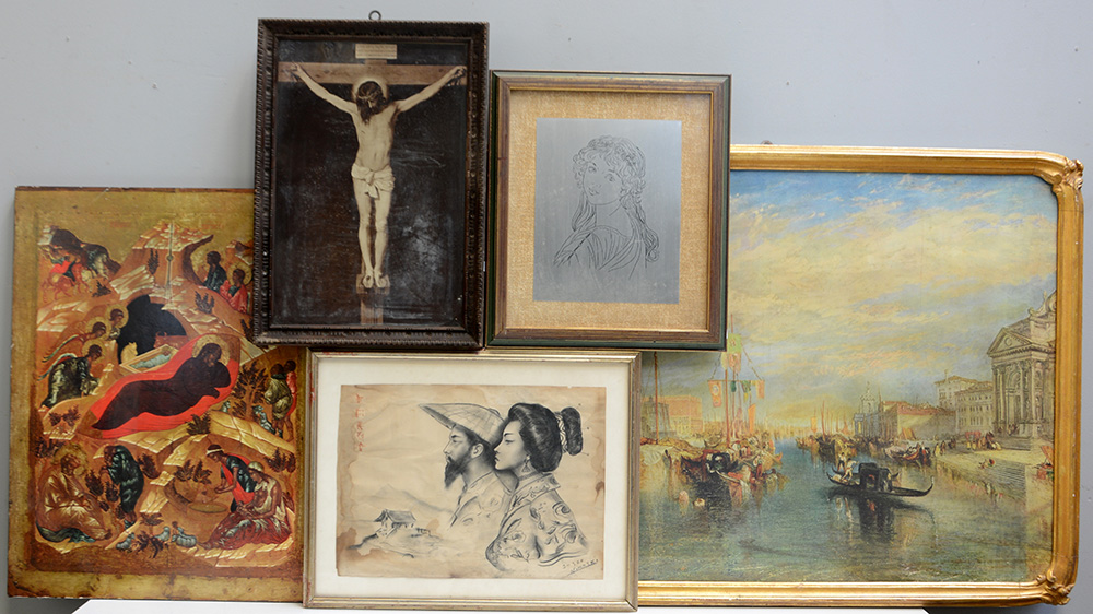 Lotto composto da una riproduzione raffigurante regata sul Canal Grande, una raffigurane un icona, una raffigurante Gesù crocifisso, un'acquarello raffigurante figure giapponesi e un multiplo su lamina, quattro in cornici (difetti)