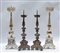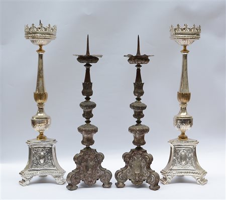 Lotto composto da due coppie di candelieri in lamina balzati a foglie e volute (difetti)