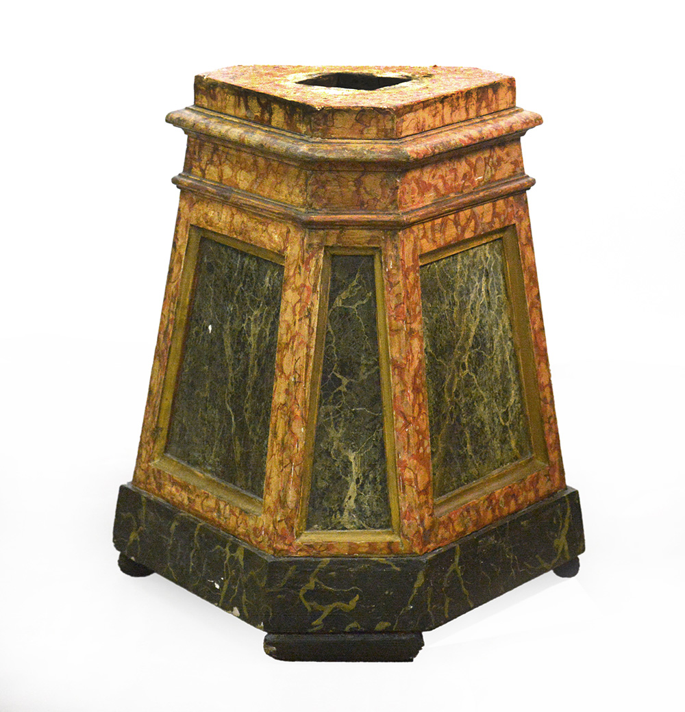 Base di forma triangolare in legno laccato in policromia a finto marmo, secolo XVIII (cm 55x73x45)(difetti)