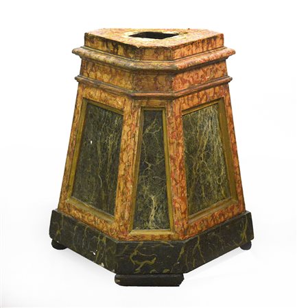 Base di forma triangolare in legno laccato in policromia a finto marmo,...