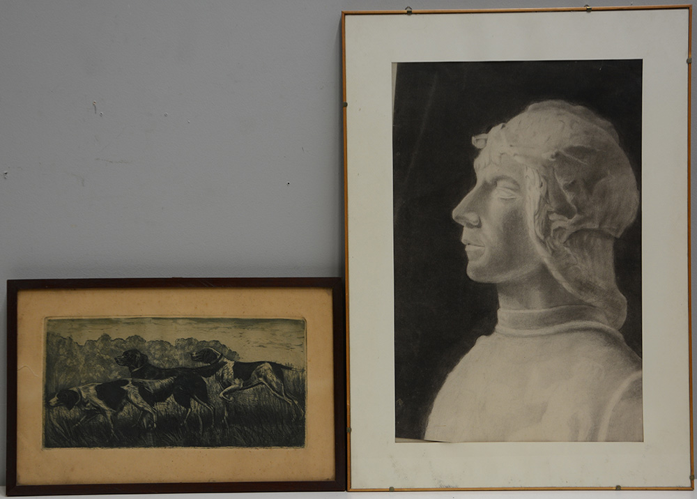 Lotto composto da un'acquaforte del secolo XIX raffiguranti cani da caccia (cm 20x40) ed un disegno accademico a carboncino raffigurante volto neoclassico (cm 56x36), in cornici (difetti)