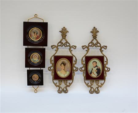 Lotto di due miniature raffiguranti Napoleone e Giuseppina e tre raffiguranti gentildonne in tre cornici in metallo e legno (difetti)