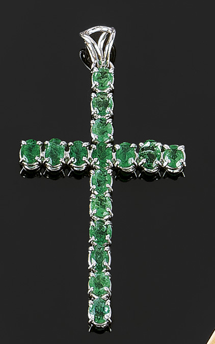 CIONDOLO Ciondolo in oro bianco a forma di croce, composto da sedici smeraldi di taglio ovale per complessivi ct 5,5 Peso gr. 7,0 Certificato di analisi R. A.G. n. VA087/5N rilasciato in data 30/09/2005