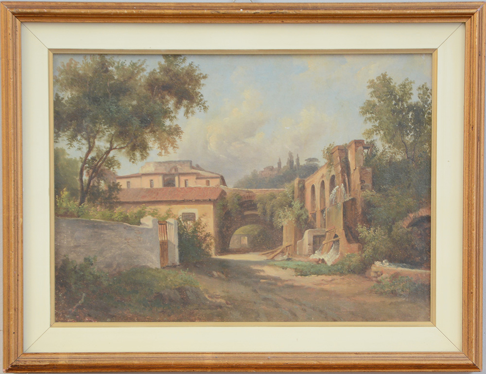 Ignoto "Paesaggio romano" olio su tela applicata su masonite (cm 27x37) in cornice