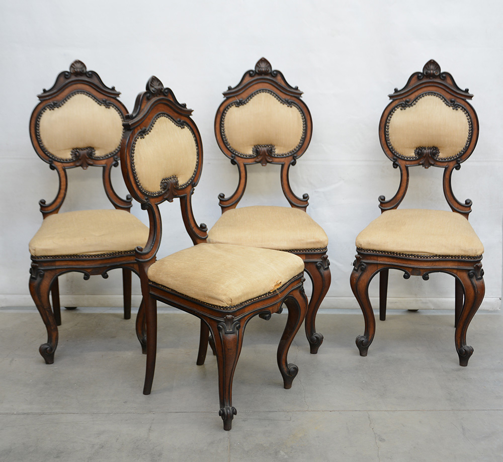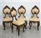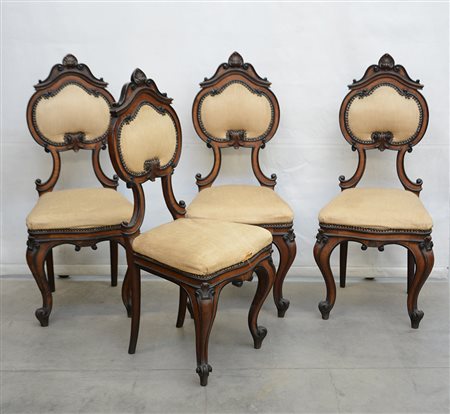 Gruppo di quattro sedie di forma sagomata in noce, profili ebanizzati. Secolo XIX (cm 44,5x101x43)