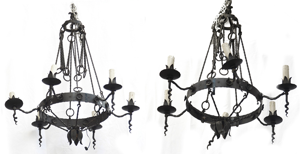 Coppia di lampadari a sei fiamme in ferro battuto a motivi vegetali e riccioli (h cm 100) (difetti)