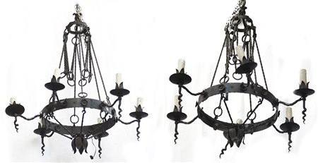 Coppia di lampadari a sei fiamme in ferro battuto a motivi vegetali e...