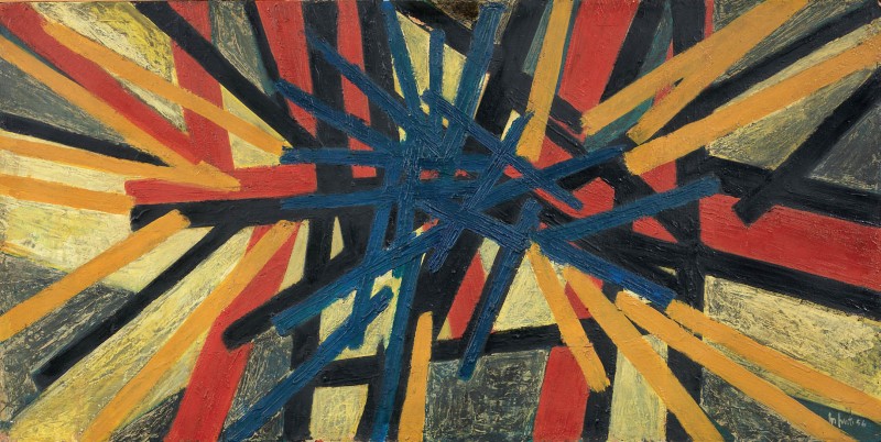 Mario Nuti Firenze 1923 - 1996 Convergenze, 1954 Olio su faesite, cm. 60,3x119,8 Firma e data in basso a destra: M. Nuti 54; firma, data e titolo al verso: Mario Nuti 1954 / Convergenze. Bibliografia: Luigi Cavallo, Mario Nuti, Edizioni Il Mappamondo, Milano, 1992, p. 60, n. 19.