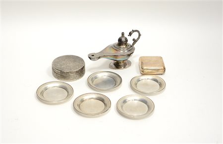Lotto composto da una piccola lanterna, due scatolette e cinque piattini in argento (gr 270 ca)
