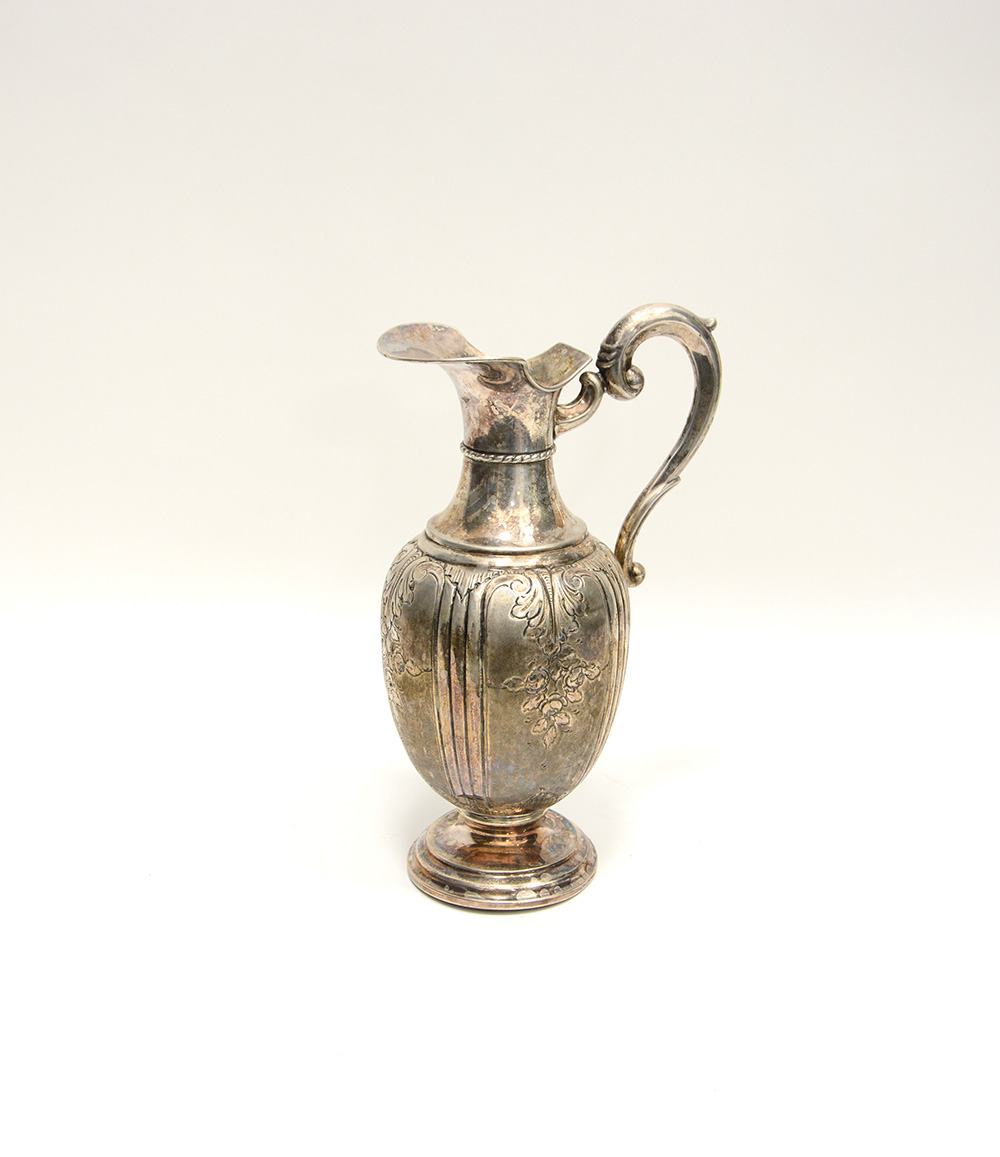 Brocca in argento con corpo inciso a motivi vegetali. manico sagoamto (gr 440 ca) (difetti)