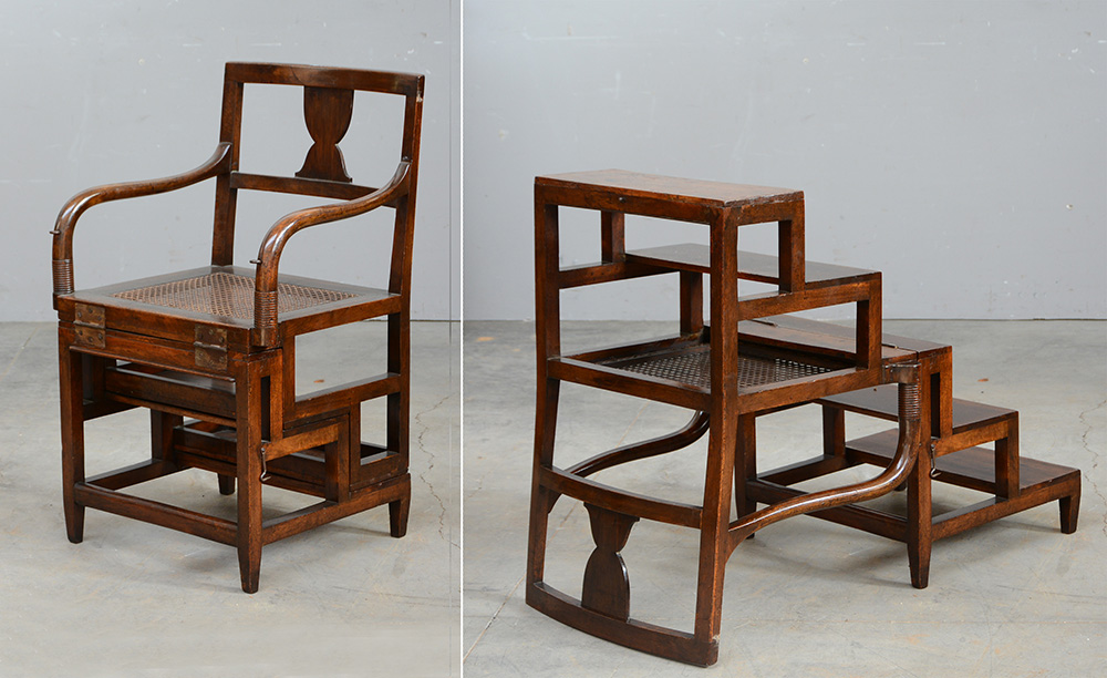 Poltroncina trasformabile a scaletta da biblioteca, schienale a giorno, braccioli curvi, secolo XIX (difetti)