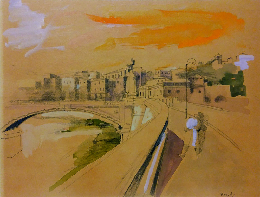 Ugo Attardi paesaggio di Roma tecnica mista su carta intelata 27x32 autentica dell'artista su foto