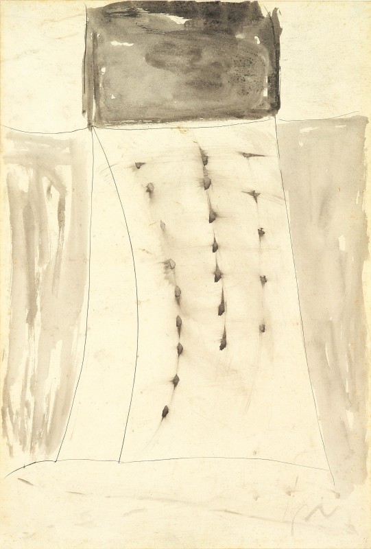 Lucio Fontana Rosario Santa Fè 1899 - Varese 1968 Composizione, 1957 Gouache su carta, cm. 56x38 Firma in basso a destra: Fontana. Opera registrata presso l'Archivio Lucio Fontana, Milano, con n. 3024/1.