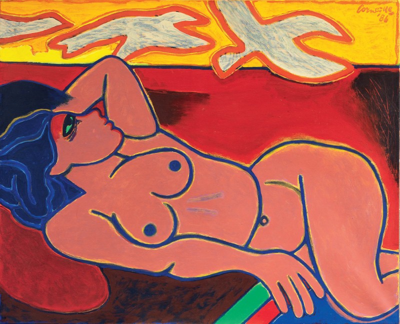 Corneille (Guillaume Beverloo) Liegi 1922 - Parigi 2010 Quand passent les oiseaux, 1986 Olio su tela, cm. 80,5x100 Firma e data in alto a destra: Corneille / '86; titolo, firma e data al verso sulla tela: Quand / passent / les oiseaux / Corneille '86: etichetta con n. 6 e timbro Palazzo Vecchio Galleria d'Arte, Firenze.