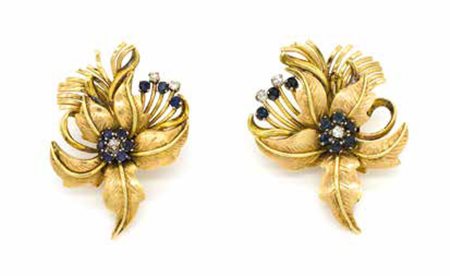 ORECCHINI in oro giallo, brillanti e zaffiri a guisa di dalia, gr. 22,8