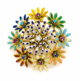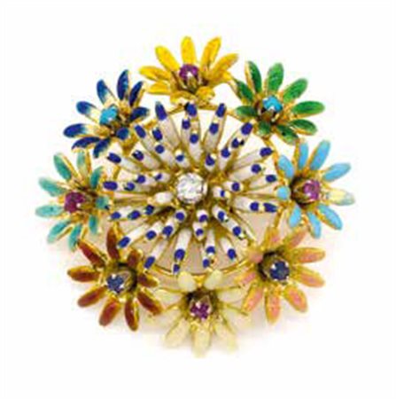 SPILLA in oro giallo con smalti a guisa di fiori, gr. 11,2