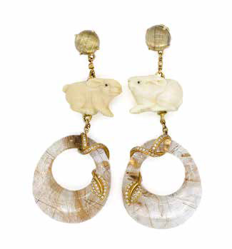 ORECCHINI LYDIA COURTEILLE in oro giallo con pendenti in quarzo rutilato, brillanti e coniglietti in avorio