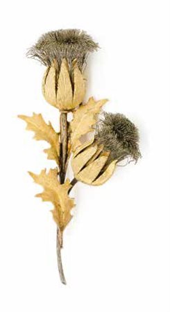 SPILLA BUCCELLATI in oro giallo e bianco a guisa di cardi, gr. 37,6