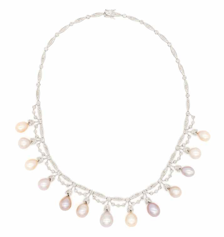 COLLIER in oro bianco con perle e brillanti, gr. 46