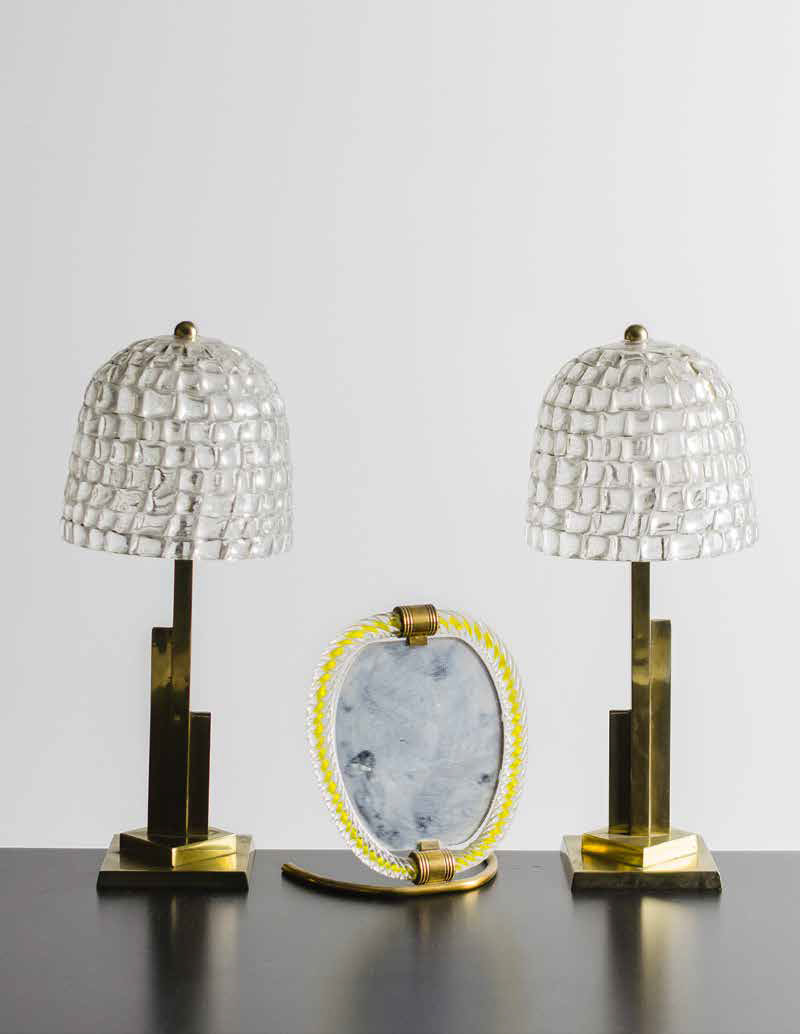 MANIFATTURA MURANESE Coppia di lampade da tavolo con struttura in ottone e...