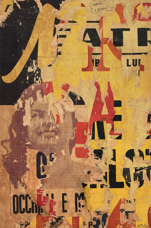 Mimmo Rotella Catanzaro 1918 - Milano 2006 A rosso con donna, 1961 Décollage su tela, cm. 105x68 Firma in basso a destra e al verso sulla tela: Rotella; sul telaio titolo e data: "A rosso con donna" (1961): timbro La Tartaruga, Roma. Storia: Collezione Plinio de Martiis, Roma; Collezione privata Bibliografia: Pierre Restany, Rotella: dal Décollage alla Nuova Immagine. I quaderni del «Nouveau Realisme» n. 1, Edizioni Apollinaire, Milano, 1963, p. n.n. e copertina (con titolo «A viso aperto» e data 1960).