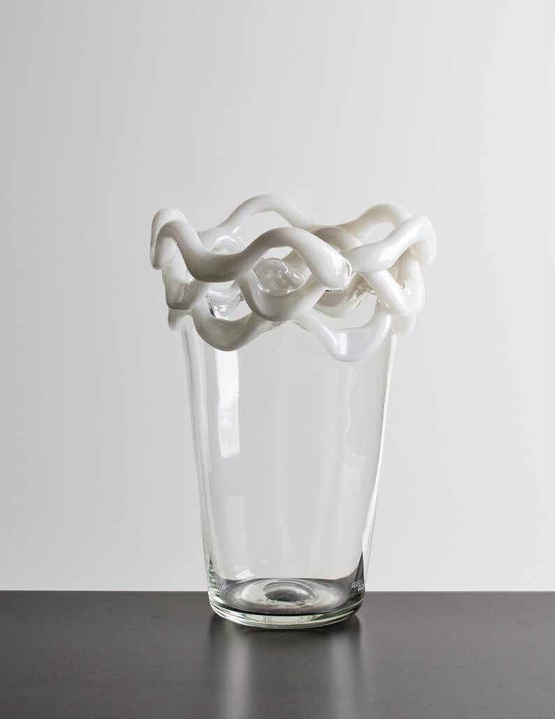 GECARA Vaso in vetro trasparente con collo decorato con applicazioni in lattimo. Firma incisa: GECARA. altezza: cm 39,5