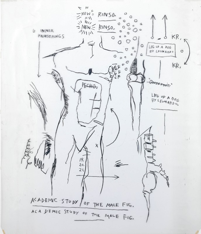 Jean Michel Basquiat New York 1960 - 1988 Anatomy II, 1982 Pastello a cera su Mylar, cm. 106,8x91,4 Al verso, su un cartone di supporto: tre etichette Galerie Jerome De Noirmont - Paris, di cui una con n. JMB 2001. Certificato su foto Authentication Committee of the Estate of Jean-Michel Basquiat, 25 aprile 2003, con n. 60659. Esposizioni: Firenze-New York. Rinascimento e Modernità. Da Luca Signorelli a Andy Warhol, Firenze, Galleria d'Arte Frediano Farsetti, 30 settembre - 10 dicembre 2011, cat. n. 37, illustrato a colori.