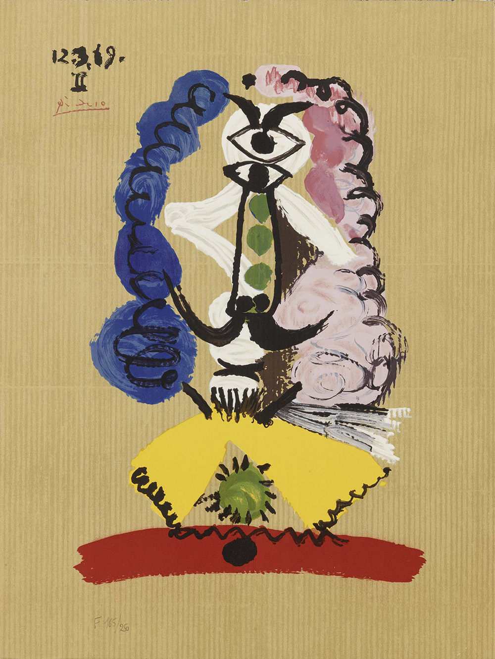 Pablo Picasso (d'après), Malaga 1881 - Mougins 1973, Imaginary Portraits, 1969, Litografia, es F 165/250, cm 65,7x50 (carta), Data e firma in lastra in alto a sinistra: 12369 / II / Picasso, tiratura in basso a sinistra a matita: F 165/250:, L'opera fa parte di una cartella di 29 litografie, Imaginary Portraits, 1969, editore Marcel Salinas Tiratura di 250 esemplari eseguiti in Francia, numerati con la lettera F, stampatore Atelier Detruit et Guillard-Gourdon, e 250 esemplari eseguiti negli USA, numerati con la lettera A, stampatore Harry N Abrams, New York