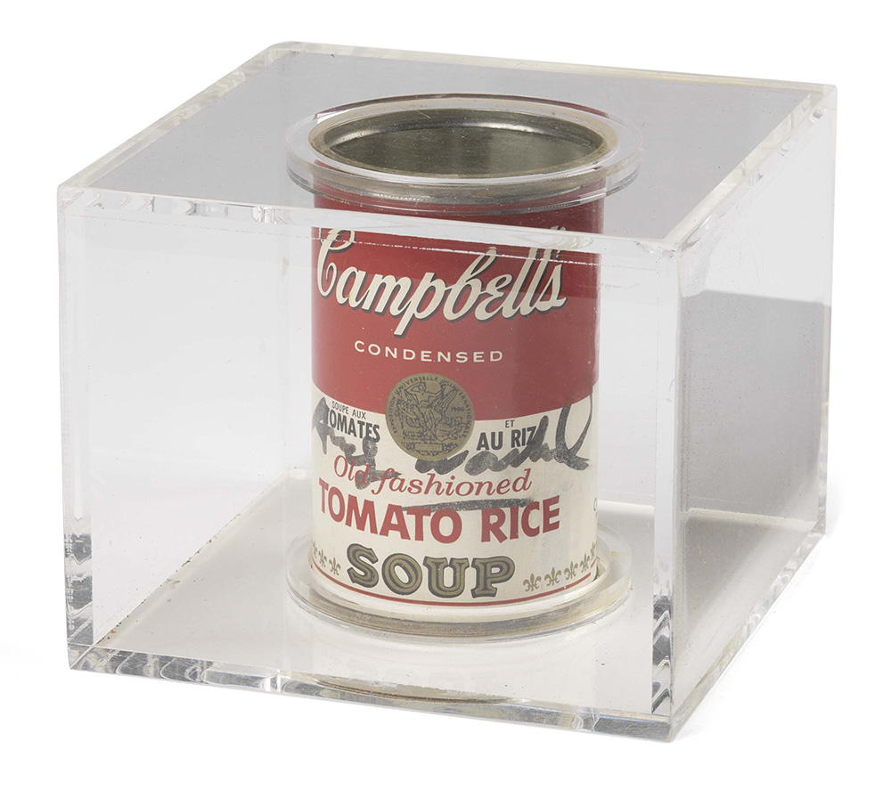 Andy Warhol, Pittsburgh 1928 - New York 1987, Campbell's Tomato Rice Soup, (1970), Lattina, cm 9,9 h, Firma su un lato: Andy Warhol All'interno: etichetta Certificato di Garanzia / Lugano, 22/10/1992